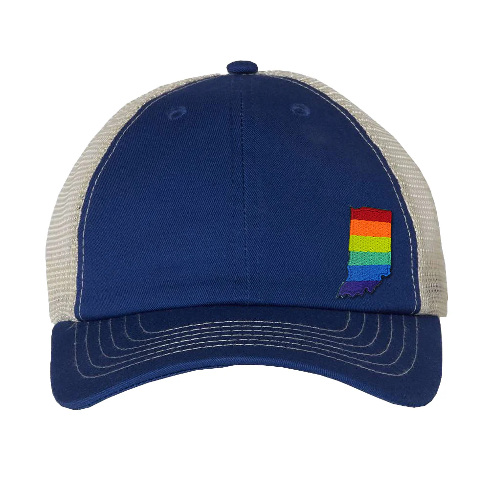 A vibrant rainbow-striped state embroidered on a vintage-style, unstructured mesh trucker cap.